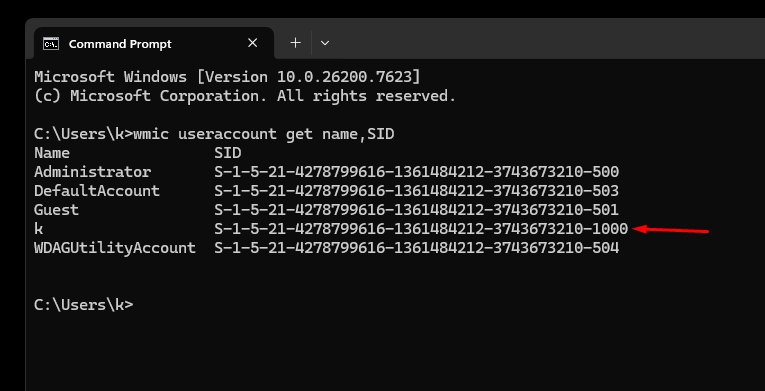 Step 4. Next we need to change the user's default folder to reflect the new username. Open a command prompt and type the following command to get the SID for the account whose username you're changing: